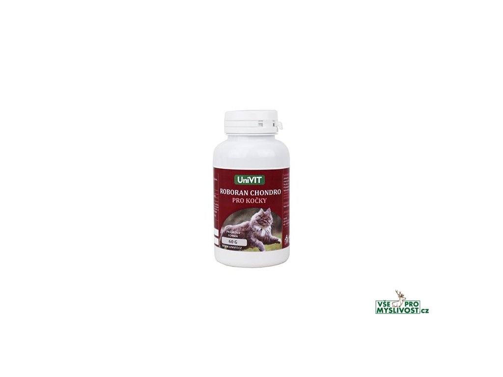 Speciální doplňkové krmivo pro kočky s obsahem směsi výtažků z mořských živočichů. Použitím přírodní suroviny je dosaženo optimálního poměru chondroitinsulfátu, glukosaminsulfátu a 3-omega mastných kyselin. Znakem přípravku je lehký pach po rybách. ROBORAN CHONDRO zajišťuje ochranu pohybového aparátu u rostoucích koťat a u starších koček s pohybovými problémy. Zlepšuje látkovou výměnu, udržuje pevnost chrupavek a vaziva, působí proti artrózám, zlepšuje pohybové schopnosti a stimuluje správný vývoj kloubů. Kvalita této směsi je srovnatelná s přípravky používanými pro lidskou výživu.