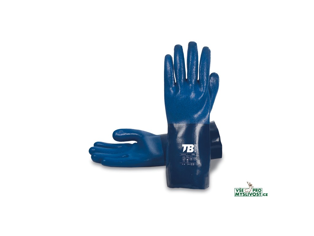 • modré nitrilové dvojité máčené rukavice • bezešvá bílá nylonová vložka • celková délka: 30 cm