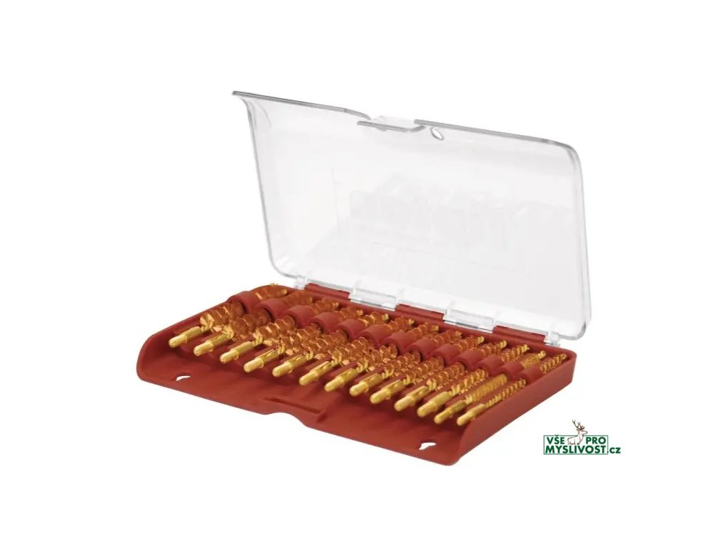 Kartáčky jsou uloženy v odolné plastové krabičce s víkem, kde má každý kartáček vlastní umístění označené podle kalibru – orientace je tak rychlá a přehledná.