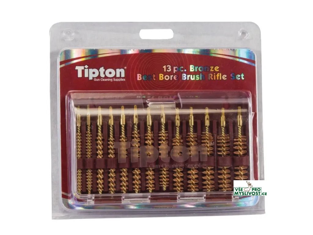 Praktická 13dílná sada bronzových vytěrákových kartáčků Tipton z řady Best Bore Brushes, navržená speciálně pro čištění puškových hlavní v rážích .17 až .45. Každý kartáček je kalibrově přesný, což zajišťuje optimální kontakt s vývrtem hlavně a tím i maximální účinnost při odstraňování nečistot a zbytků po výstřelu.