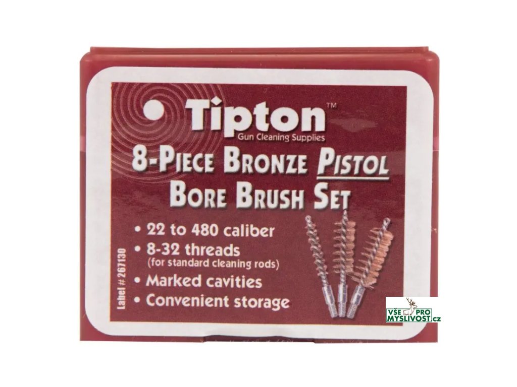 - 8dílná sada kalibrově specifických kartáčků pro čištění vývrtu hlavně pistolí - Bronzové štětiny z fosforového bronzu - Standardní závit 8-32 kompatibilní s většinou vytěrákových tyčí - Odolná krabička s přihrádkami označenými podle kalibru