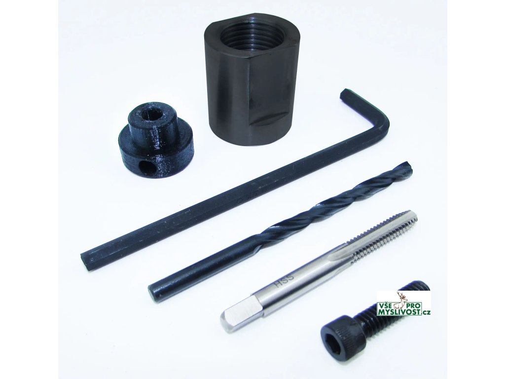 Součástí sady je unikátní přípravek, který se našroubuje na matrici. Slouží pak zároveň jako vedení pro vrták a pro vytahovací šroub.