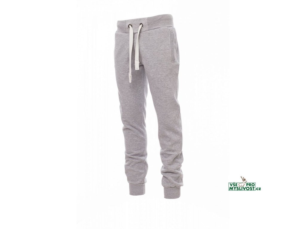 Pánské teplákové kalhoty s elastickým žebrováním v pase a na nápletech nohavic, poklopec na zip, bílá stahovací šňůrka s kontrastním prošitím a kovovými kroužky, dvě přední kapsy s žebrovaným lemem, zadní kapsička s klopou na zip a zesílenými švy.