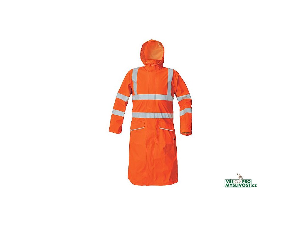 • nepromokavý a větruodolný prodloužený plášť s kapucí v límci, délka 120 cm • zapínání na oboustranný zip krytý légou s druky • reflexní pruhy po obvodu pasu, boků, rukávů a přes ramena • obvod kapuce lze stáhnout na tkaničku • dvě přední kapsy kryté légami s reflexní paspulí pro zvýšení viditelnosti • spodní lem rukávů lze upravit drukem • EN 20471 ISO: Třída 3 je v HI-VIS provedení ve žluté a oranžové barvě