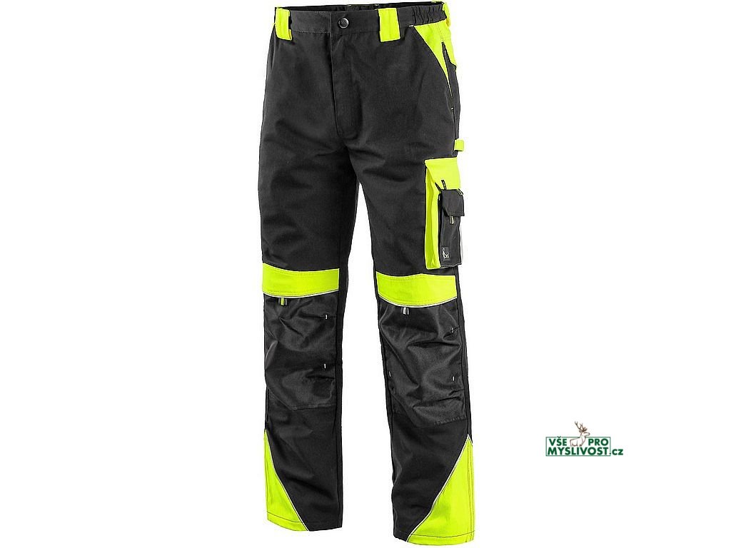 Pánské montérkové kalhoty, pas s poutky na opasek a gumou v bocích, přední klínové kapsy, multifunkční kapsy na obou stranách, kolena zesílena materiálem 600D polyesterem s možností vložení kolenních výztuh, dvě zadní kapsy s klopami, reflexní doplňky. Doporučené použití: stavebnictví, strojírenství, lehký průmysl, práce na silnici, odtahové služby, automobilový průmysl, logistika, skladová manipulace, spedice, autoservisy, údržba, montáže, zemědělství, zahrada, hobby.
