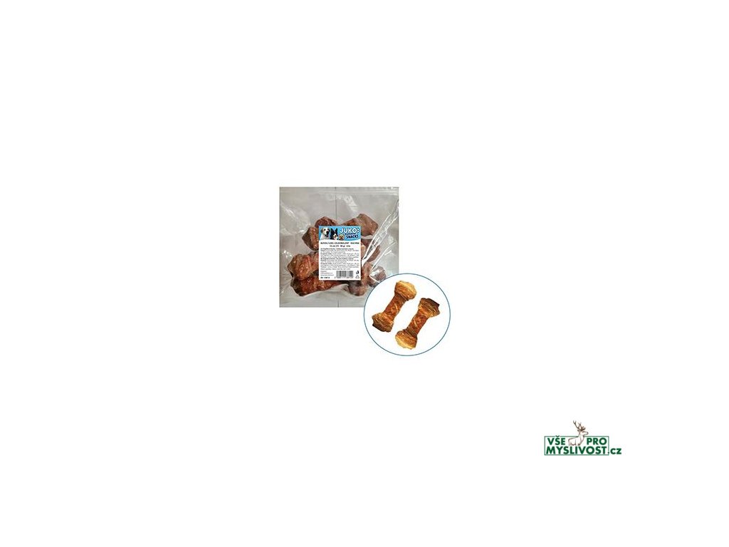 Doplňkové krmivo pro psy.Pamlsek lisovaný z kůže, obalený sušeným kachním masem.