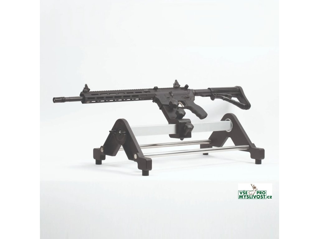 Polstrované svorky s výškovým nastavením o 5 cm a nastavitelným rozsahem uchycení od 7,6 cm do 43 cm poskytují maximální flexibilitu. Díky nastavitelným nožkám je zajištěna stabilita i na nerovných površích. Součástí stolice je i uzamykatelná podpěra zásobníkové šachty AR, která zajišťuje pevné uchycení pušky bez nežádoucího pohybu.