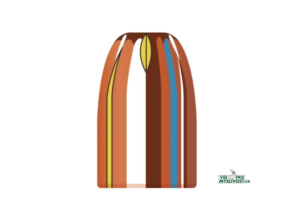 Plášť chrání špičku střely, aby dutina při nárazu správně fungovala, zatímco rovnoměrná hustota jádra zajišťuje vyváženou expanzi a stabilitu za letu.