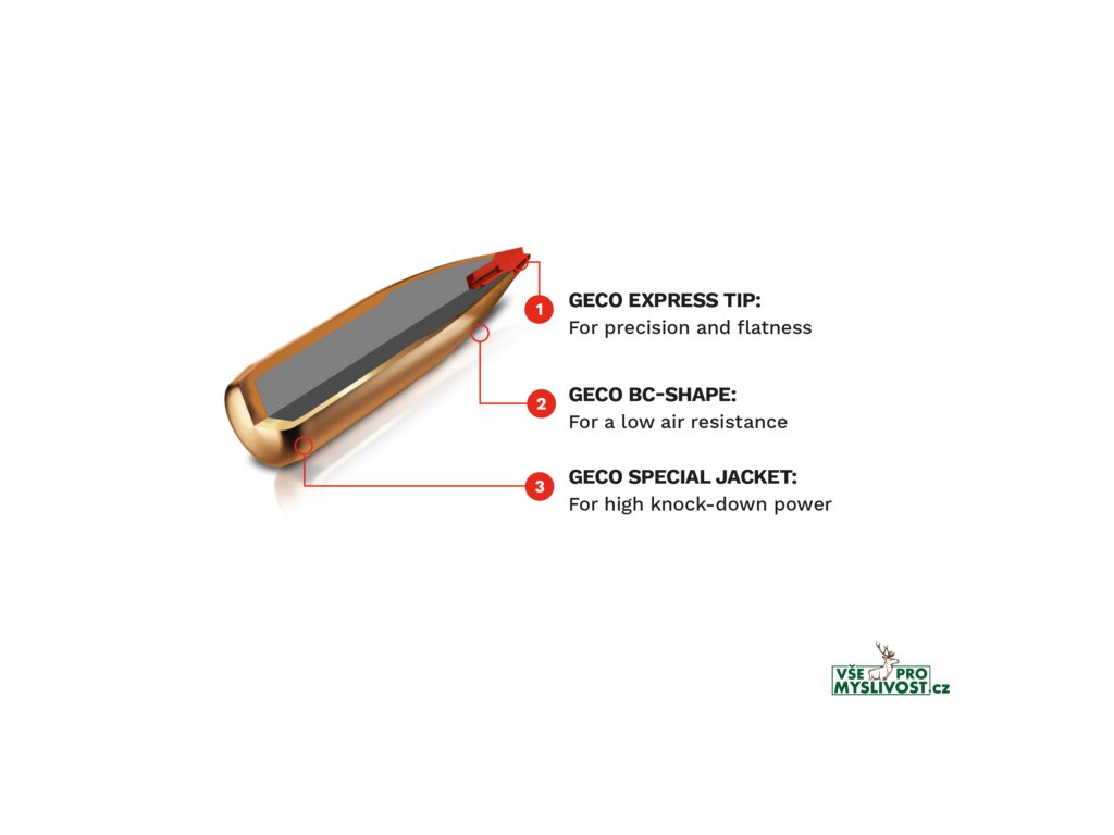 Střela GECO EXPRESS je vhodná pro všechny způsoby lovu, které vyžadují přesnost a účinnost na velkou vzdálenost. Jednoznačně hladká, balisticky optimální linie střely je ukončena polymerovým hrotem GECO EXPRESS TIP. Toto řešení umožňuje precizní střelbu na dlouhé vzdálenosti, přesnou a rychlou expanzi.Díky tvaru střely GECO BC-SHAPE a konstrukci pláště GECO SPECIAL-JACKET je vysoká rychlost téměř konstantní po celé dráze střely a v okamžiku zásahu se přeměňuje v energii, která má velký ranivý účinek.
