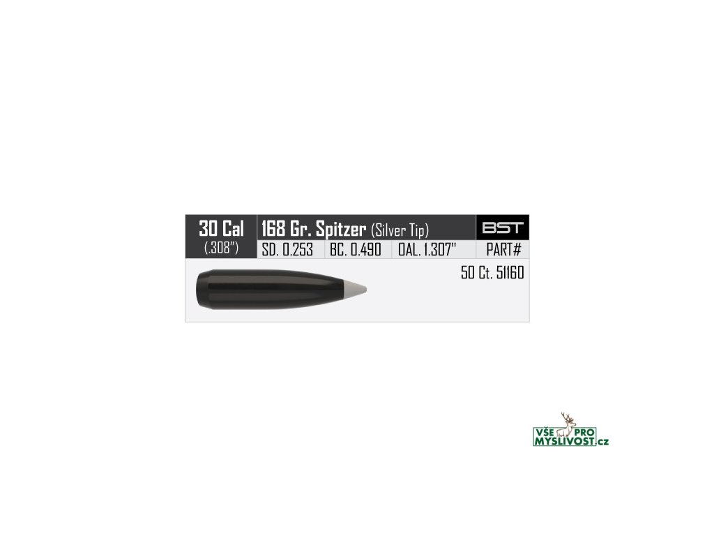 Střely Nosler Ballistic Silvertip .30 cal, dia .308, 168grs (10,8g). SKU: 51160