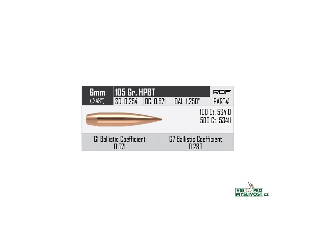 Střely Nosler Reduced Drag Factor (RDF) 6mm, dia .243, 105grs (6,8g). SKU: 53410
