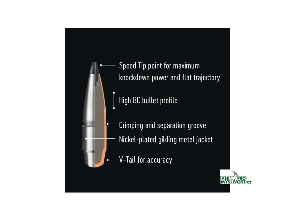 Rychlá expanze střely je zajištěna díky technologii Speed Tip, která využívý dutou špičku a snadno fragmentované přední jádro. Tvrdší zadní jádro střely zaručuje penetraci.