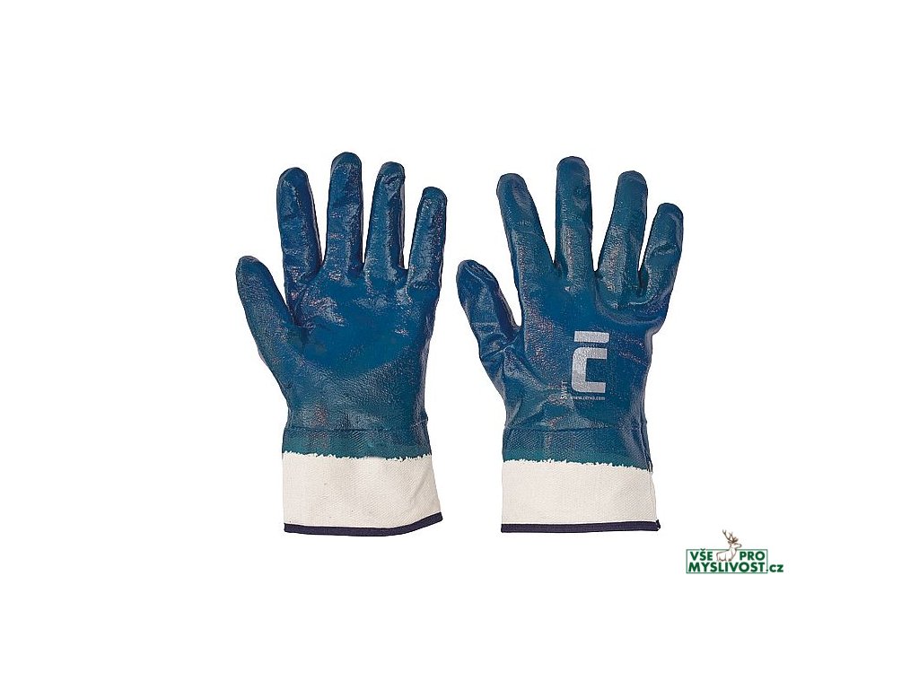 • rukavice šité z bavlněného úpletu • celomáčené v nitrilu • pevná manžeta