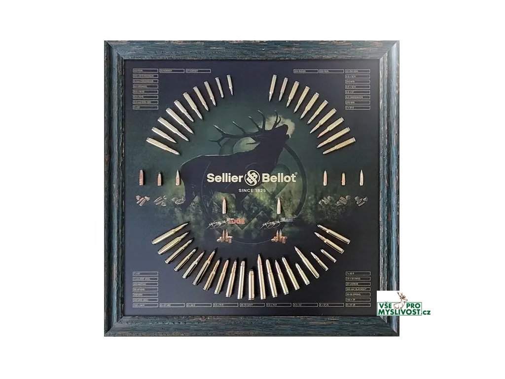 Exkluzivní dekorativní tablo Sellier & Bellot představuje širokou škálu kulové munice tohoto tradičního českého výrobce. V elegantním dřevěném rámu jsou uspořádány reálné střely i celé náboje různých ráží, které vytvářejí atraktivní kompozici se siluetou jelena uprostřed.