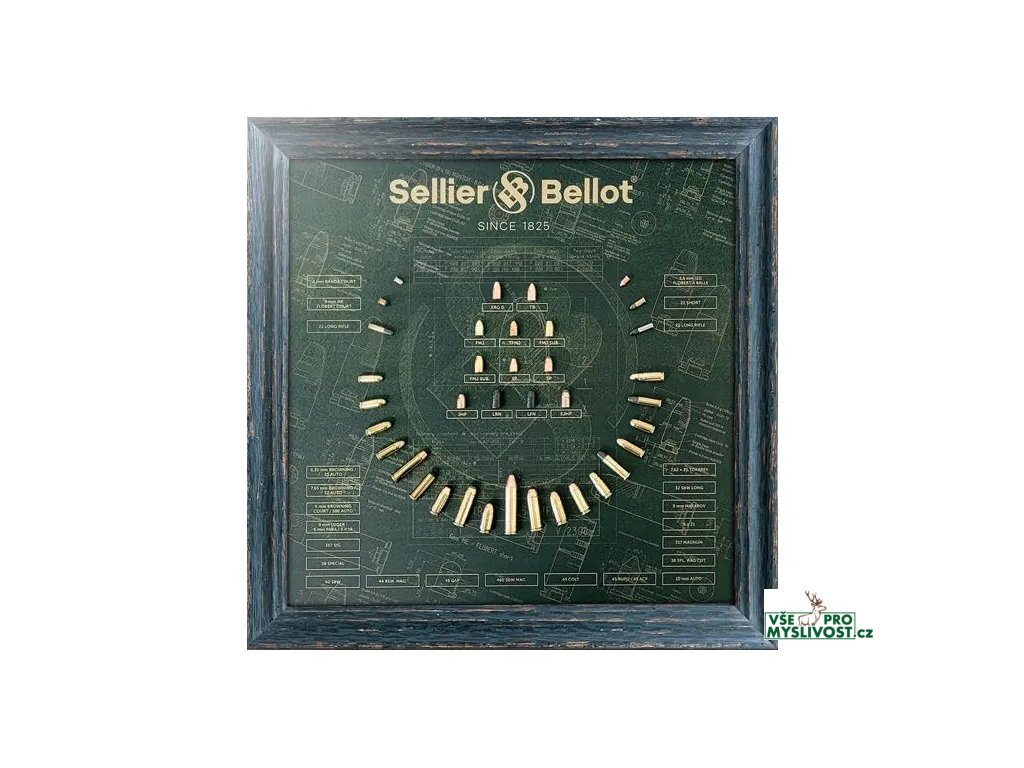 Exkluzivní pistolové tablo Sellier & Bellot představuje širokou škálu pistolové a revolverové munice tohoto tradičního českého výrobce. V elegantním dřevěném rámu jsou přehledně uspořádány reálné střely i celé náboje různých ráží, které vytvářejí atraktivní kompozici na technickém podkladu s náčrty nábojů.