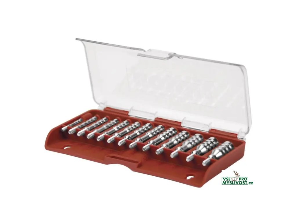 - 13dílná sada čistících trnů Ultra Jag pro různé ráže - Uloženo v odolné krabičce s víkem a označením podle ráže - Určeno pro ráže .17 až .45 (neobsahuje kalibr .20) - Standardní závit 8-32, kalibr (.17 má závit 5-40) - Kompatibilní se standardními vytěrákovými tyčemi