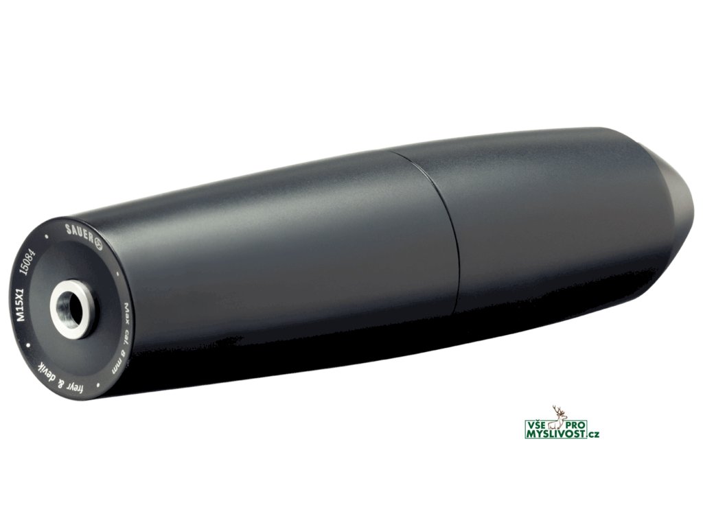 - model Titanium PRO, produkt norské fi rmy Freyr & Devik - určeno pro modely Sauer 100 ♣ Sauer 101 ♣ Sauer 505 - technické parametry : plášť z titanu, vnější průměr 45 mm, celková délka 205 mm, skutečné prodloužení zbraně 130 mm, přesah zpět od ústí ke střelci 75 mm, našroubován na závit 15x1 - redukce hluku : cca 25 dB pro kalibr .308 Win. rozdělení podle kalibrů: skupina 1 . . . kalibr ≤ 6,5 mm ♣ skupina 2 . . . kalibr ≤ 8 mm ♣ skupina 3 . . . kalibr ≤ 9,5 mm