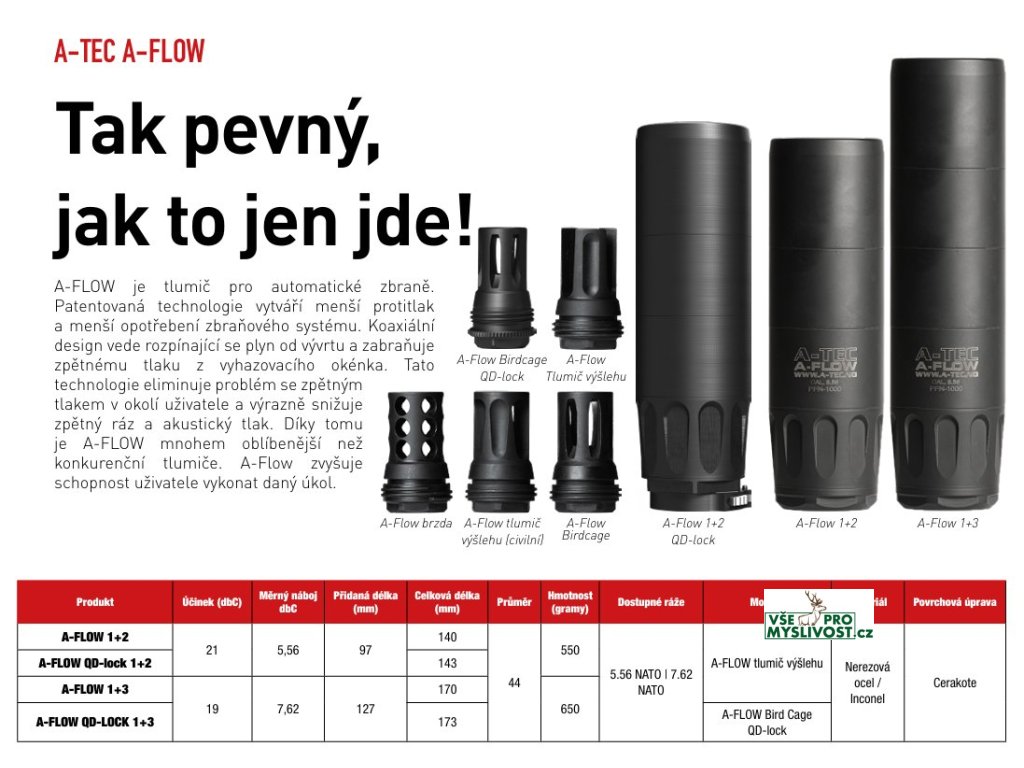 A-FLOW je tlumič pro automatické zbraně. Patentovaná technologie vytváří menší protitlak a menší opotřebení zbraňového systému. Koaxiální design vede rozpínající se plyn od vývrtu a zabraňuje zpětnému tlaku z vyhazovacího okénka. Tato technologie eliminuje problém se zpětným tlakem v okolí uživatele a výrazně snižuje zpětný ráz a akustický tlak. Díky tomu je A-FLOW mnohem oblíbenější než konkurenční tlumiče. A-Flow zvyšuje schopnost uživatele vykonat daný úkol.