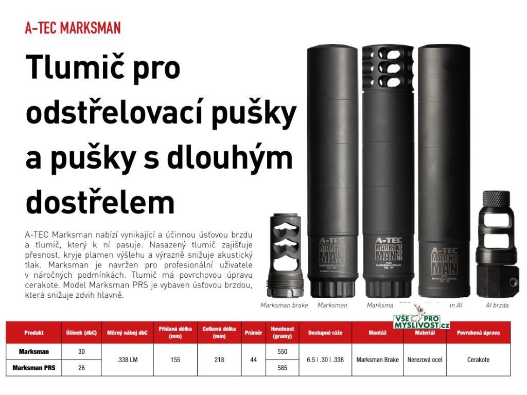 A-TEC Marksman nabízí vynikající a účinnou úsťovou brzdu a tlumič, který k ní pasuje. Nasazený tlumič zajišťuje přesnost, kryje plamen výšlehu a výrazně snižuje akustický tlak. Marksman je navržen pro profesionální uživatele v náročných podmínkách. Tlumič má povrchovou úpravu cerakote. Model Marksman PRS je vybaven úsťovou brzdou, která snižuje zdvih hlavně.