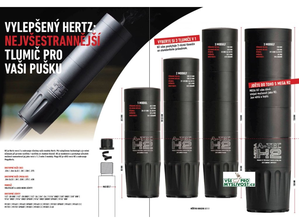 A-TEC H2 a H2 Mega - kompletní popis technická data, seznam ráží a systémů upnutí v katalogu A-TEC v Českém jazyce ke stažení na našich stránkách. Bezkonkurenčně nejžádanější a nejprodávanější model. H2 je modulový tlumič, který je určen pro opakovací, samonabíjecí, lovecké a sportovní zbraně bez předních mířidel. Jde 8cm zpět přes hlaveň a přidává pouze 15cm se všemi 3 moduly k celkové délce zbraně! Jednotlivé moduly lze jednoduše odebírat a docílit tak ještě kompaktnějšího setu zbraně a tlumiče, což může být výhodné např. při naháňkách, dosledech, čištění a údržbě. Model H2 Mega je pouze větší a je určen pro lepší účinek např. u ráží magnum apod. https://www.youtube.com/watch?v=joO_XDBxwOA