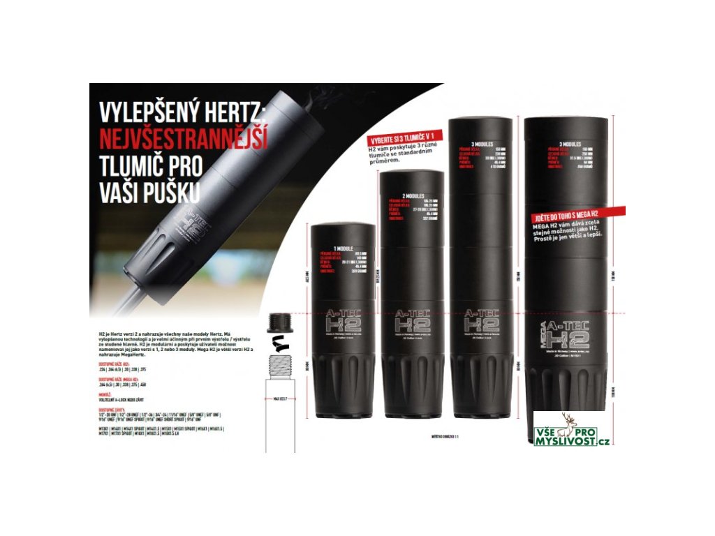 A-TEC H2 a H2 Mega - kompletní popis technická data, seznam ráží a systémů upnutí v katalogu A-TEC v Českém jazyce ke stažení na našich stránkách. Bezkonkurenčně nejžádanější a nejprodávanější model. H2 je modulový tlumič, který je určen pro opakovací, samonabíjecí, lovecké a sportovní zbraně bez předních mířidel. Jde 8cm zpět přes hlaveň a přidává pouze 15cm se všemi 3 moduly k celkové délce zbraně! Jednotlivé moduly lze jednoduše odebírat a docílit tak ještě kompaktnějšího setu zbraně a tlumiče, což může být výhodné např. při naháňkách, dosledech, čištění a údržbě. Model H2 Mega je pouze větší a je určen pro lepší účinek např. u ráží magnum apod. https://www.youtube.com/watch?v=joO_XDBxwOA
