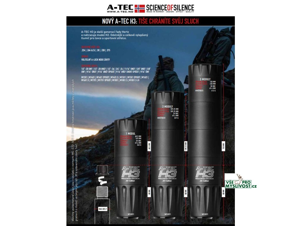 A-TEC H3 nahrazuje doposud nejžádanější a nejprodávanější model H2. Přináší vyšší účinnost (zejména u prvního výstřelu), odolnější konstrukci s ohledem na méně pečlivou údržbu, modernější design a nižší hmotnost. Model H3 je modulový tlumič určen pro opakovací i samonabíjecí lovecké a sportovní zbraně bez předních mířidel. Reflexní tělo jde cca 8 ,cm zpět přes hlaveň a s třemi moduly přidává ~15 ,cm k celkové délce zbraně.