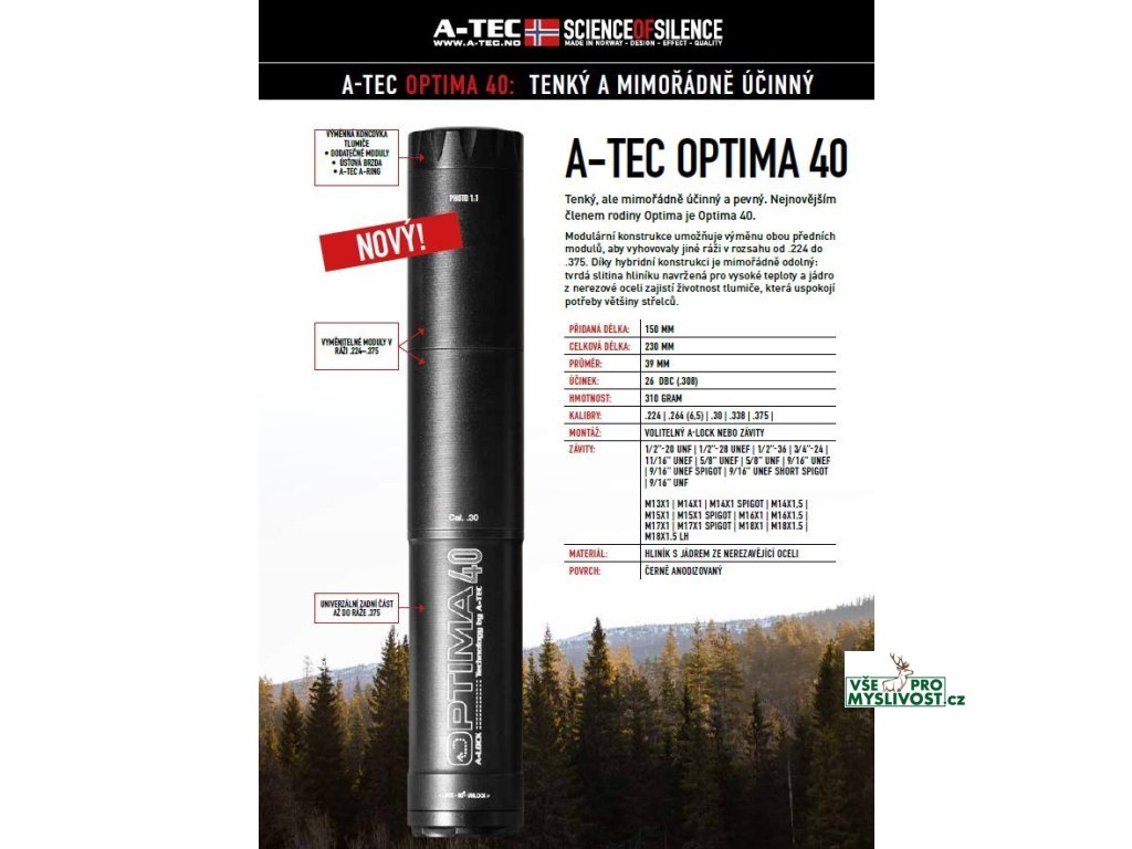 A-TEC Optima - kompletní popis technická data, seznam ráží a systémů upnutí v katalogu A-TEC v Českém jazyce ke stažení na našich stránkách. Modely Optima 60, 50, 45 a 40 jsou určeny pro lovecké a sportovní opakovací, samonabíjecí zbraně, bez předních mířidel. Optima 40 je tlumič vhodný pro subtilní zbraně, kde chete mít kompaktní, účinný tlumič. Smysl má od ráží .17" až do cca .308 Win, případne .30-06 Spr. Při redukci jednoho modulu a osazení modulem s úsťovou brzdou se jedná o neskutečně kompaktní a účinný set, který Vás útlumem a redukcí zpětného rázu ohromí. Tlumič jde o 8cm zpět přes hlaveň a přidává tak pouze 15cm k celkové délce zbraně. Přední modul tlumiče je výměnný a lze tak mít jeden tlumič s výměnou sadou modulů pro různé ráže. Model Optima Front je určen pro zbraně s předními mířidly a celou svojí délkou jde dopředu před ústí, opět lze měnit přední modul za modul pro jiné ráže Model Optima Flow je určen speciálně pro samonabíjecí lovecké a sportovní zbraně. Technologie A-FLOW snižuje tlak a tok plynů zpět směrem k výchozímu okénku zbraně. Nejde zpět přes hlaveň a lze měnit přední modul