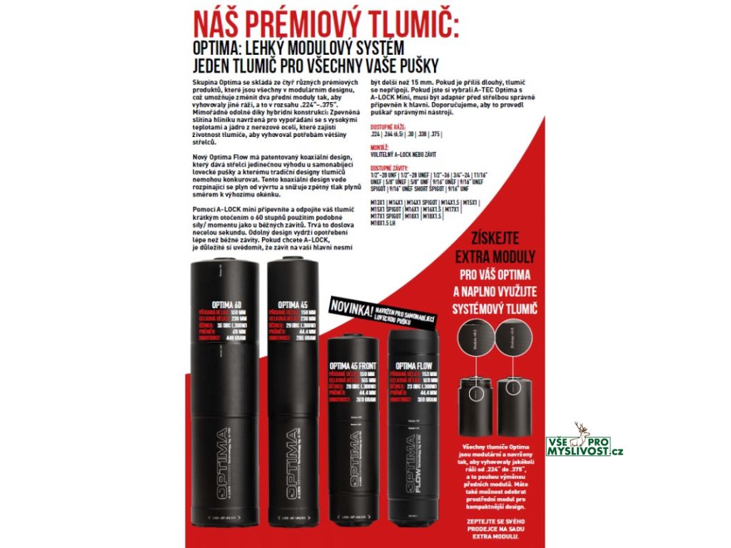 Řada A-TEC Optima představuje šest prémiových, modulárních tlumičů navržených pro lovecké a sportovní pušky. Všechna provedení mají vyměnitelné přední moduly, díky nimž lze jeden tlumič přizpůsobit pro různé ráže (přibližně .224" – .375"). Hybridní konstrukce kombinuje tepelně odolnou slitinu hliníku s vnitřním jádrem z nerezové oceli pro dlouhou životnost a nízkou hmotnost.