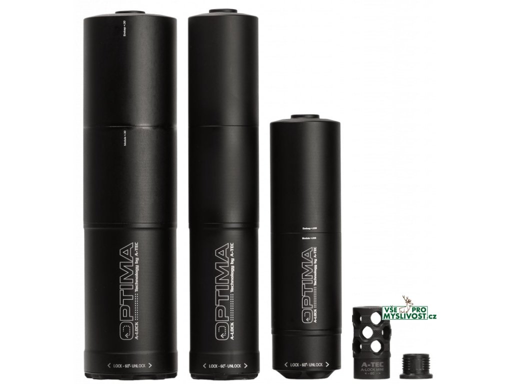 A-TEC Optima - kompletní popis technická data, seznam ráží a systémů upnutí v katalogu A-TEC v Českém jazyce ke stažení na našich stránkách. Modely Optima 60, 50 a 45 jsou určeny pro lovecké a sportovní opakovací, samonabíjecí zbraně, bez předních mířidel. Tlumič jde o 8cm zpět přes hlaveň a přidává tak pouze 15cm k celkové délce zbraně. Přední modul tlumiče je výměnný a lze tak mít jeden tlumič s výměnou sadou modulů pro různé ráže. Model Optima Front je určen pro zbraně s předními mířidly a celou svojí délkou jde dopředu před ústí, opět lze měnit přední modul za modul pro jiné ráže Model Optima Flow je určen speciálně pro samonabíjecí lovecké a sportovní zbraně. Technologie A-FLOW snižuje tlak a tok plynů zpět směrem k výchozímu okénku zbraně. Nejde zpět přes hlaveň a lze měnit přední modul