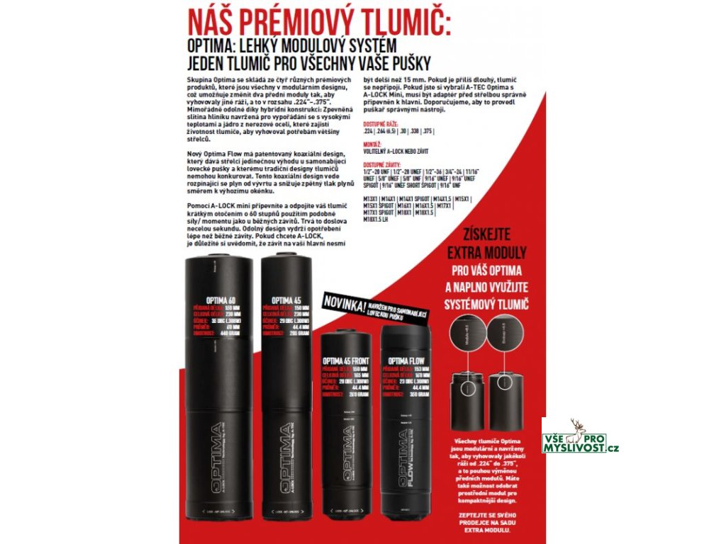A-TEC Optima - kompletní popis technická data, seznam ráží a systémů upnutí v katalogu A-TEC v Českém jazyce ke stažení na našich stránkách. Modely Optima 60 a 45 jsou určeny pro lovecké a sportovní opakovací, samonabíjecí zbraně, bez předních mířidel. Tlumič jde o 8cm zpět přes hlaveň a přidává tak pouze 15cm k celkové délce zbraně. Přední modul tlumiče je výměnný a lze tak mít jeden tlumič s výměnou sadou modulů pro různé ráže. Model Optima Front je určen pro zbraně s předními mířidly a celou svojí délkou jde dopředu před ústí, opět lze měnit přední modul za modul pro jiné ráže Model Optima Flow je určen speciálně pro samonabíjecí lovecké a sportovní zbraně. Technologie A-FLOW snižuje tlak a tok plynů zpět směrem k výchozímu okénku zbraně. Nejde zpět přes hlaveň a lze měnit přední modul