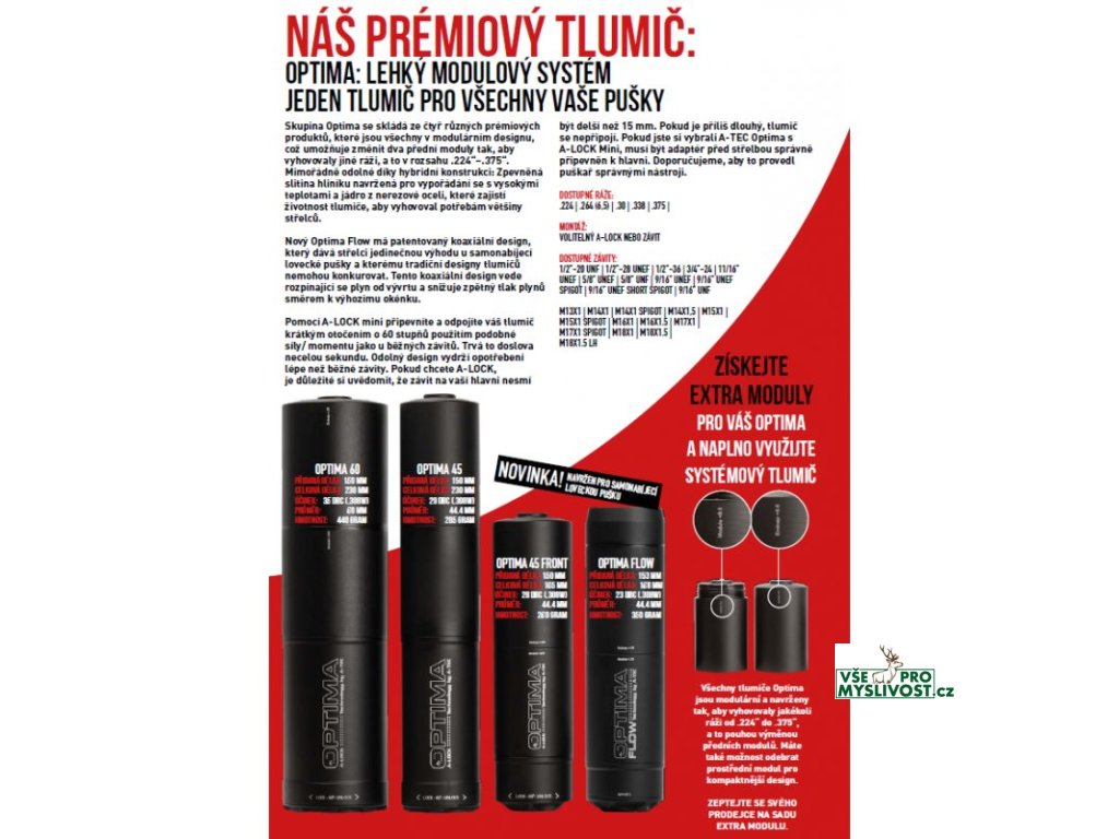 Řada A-TEC Optima zahrnuje několik prémiových modelů s modulárním designem. Všechny modely umožňují výměnu předního modulu, takže jeden tlumič lze upravit pro různé ráže pomocí sad modulů (.224" – .375"). Hybridní konstrukce kombinuje zpevněnou hliníkovou slitinu odolnou vůči vysokým teplotám s nerezovým ocelovým jádrem pro dlouhou životnost.