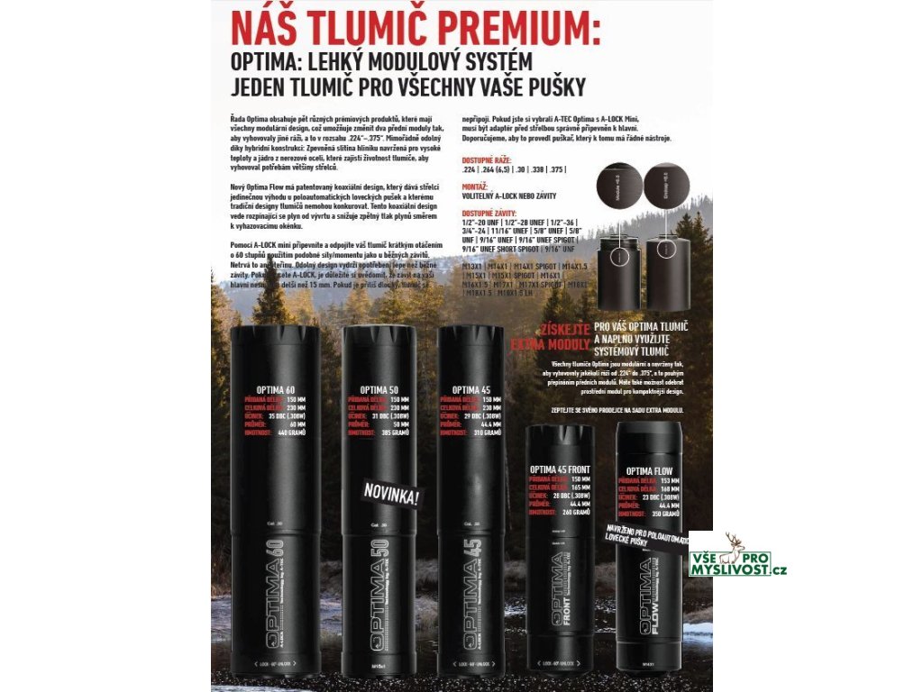 Kompletní popis, technická data, seznam ráží a systémů upnutí najdete v katalogu A-TEC v češtině ke stažení níže. Modely Optima 50, 60 a 45 jsou určeny pro lovecké a sportovní opakovací i samonabíjecí zbraně bez předních mířidel. Reflexní konstrukce jde cca 8 ,cm zpět přes hlaveň a přidává pouze ~15 ,cm k celkové délce zbraně. Přední modul tlumiče je výměnný, takže můžete mít jeden tlumič a měnit sadu modulů pro různé ráže.