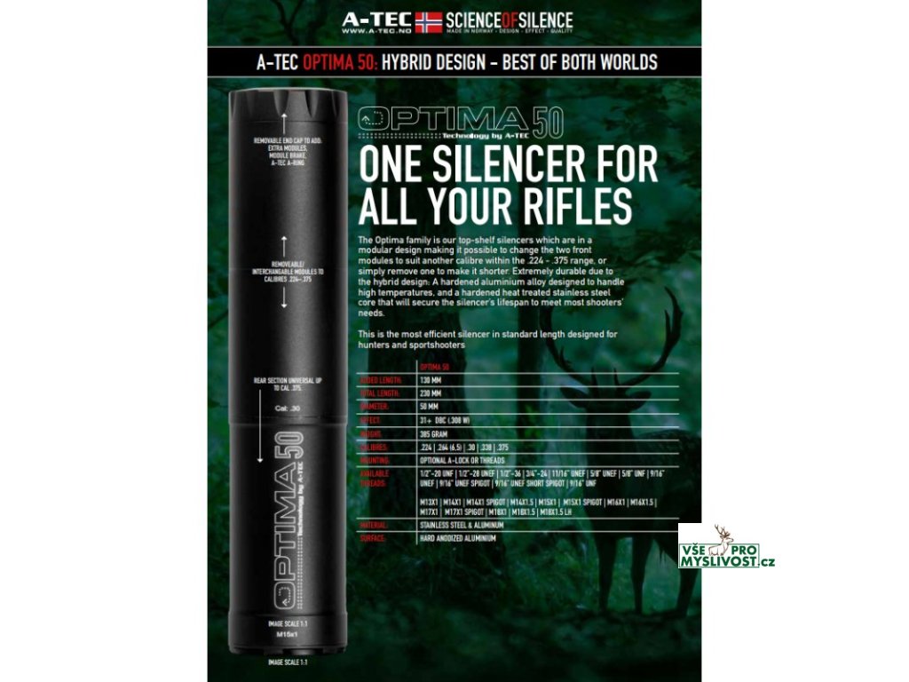 Kompletní popis, technická data, seznam ráží a systémů upnutí najdete v katalogu A-TEC v češtině ke stažení níže. Modely Optima 50, 60 a 45 jsou určeny pro lovecké a sportovní opakovací i samonabíjecí zbraně bez předních mířidel. Reflexní konstrukce jde cca 8 ,cm zpět přes hlaveň a přidává pouze ~15 ,cm k celkové délce zbraně. Přední modul tlumiče je výměnný, takže můžete mít jeden tlumič a měnit sadu modulů pro různé ráže.