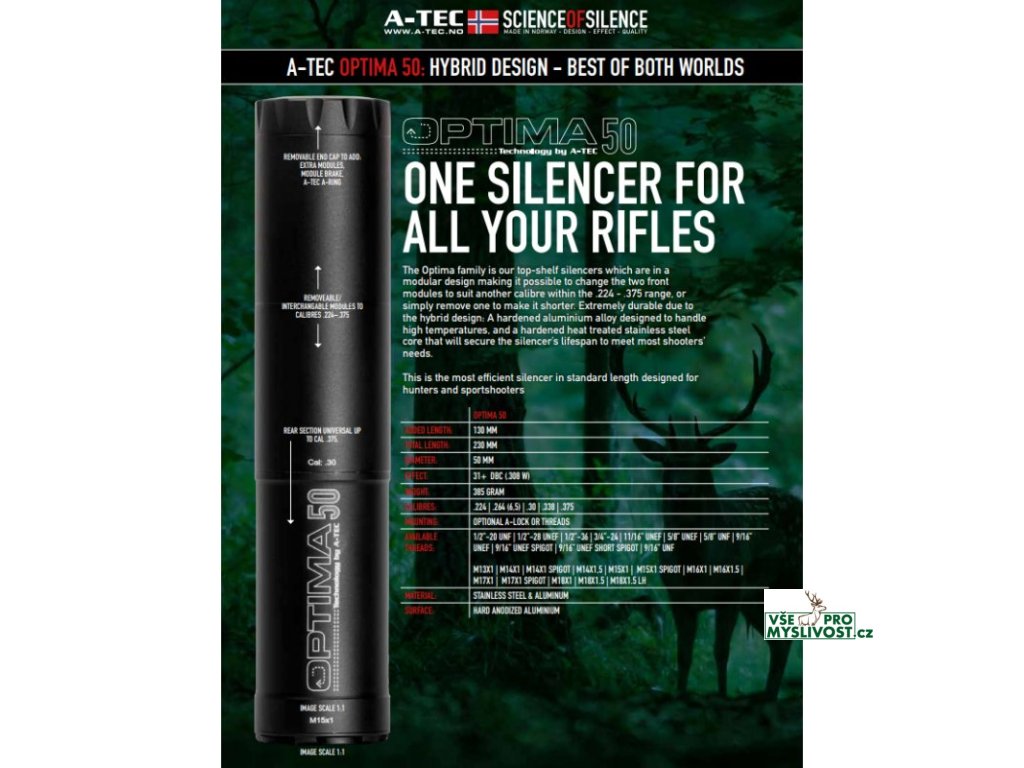 Tlumič A-TEC, model OPTIMA 50, modulový, pro ráže do .375" (9,5mm), na závit M15x1mm