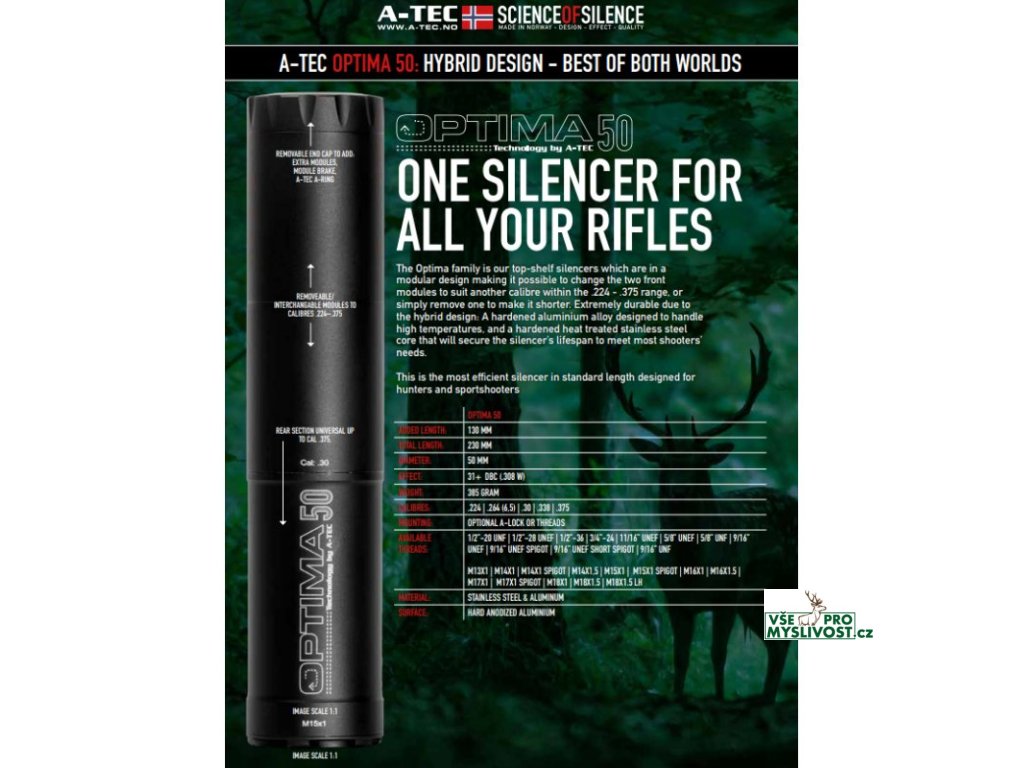 Kompletní popis, technická data, seznam ráží a systémů upnutí najdete v katalogu A-TEC v češtině ke stažení níže. Modely Optima 50, 60 a 45 jsou určeny pro lovecké a sportovní opakovací i samonabíjecí zbraně bez předních mířidel. Reflexní konstrukce jde cca 8 ,cm zpět přes hlaveň a přidává pouze ~15 ,cm k celkové délce zbraně. Přední modul tlumiče je výměnný, takže můžete mít jeden tlumič a měnit sadu modulů pro různé ráže.