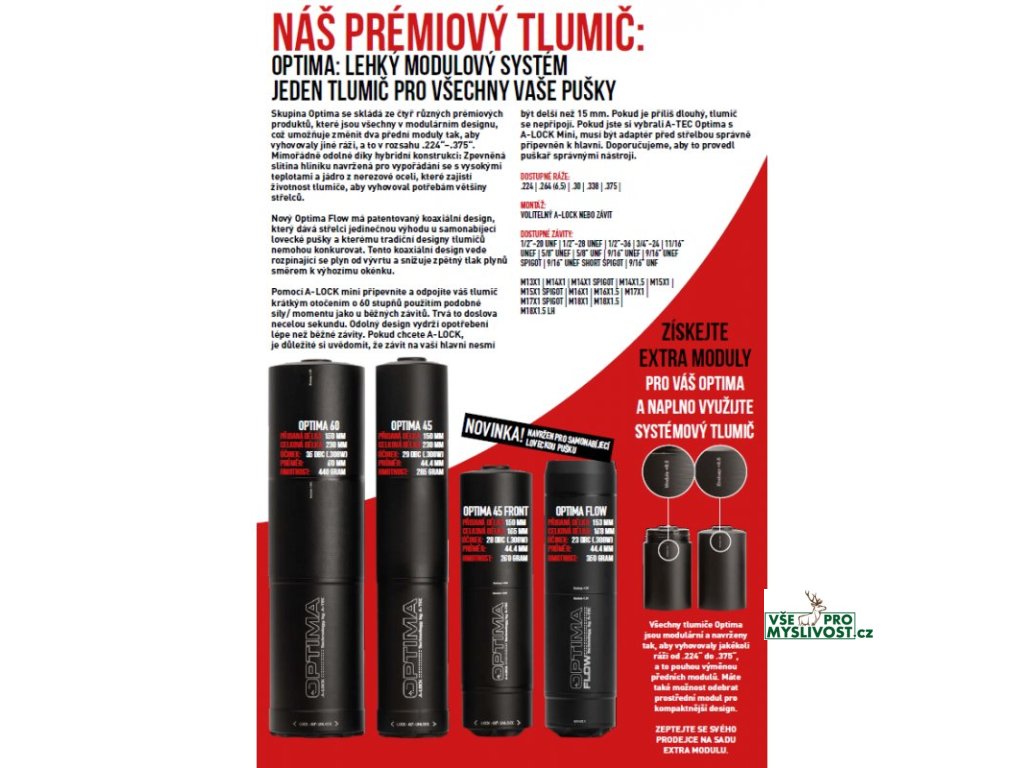 A-TEC Optima - kompletní popis technická data, seznam ráží a systémů upnutí v katalogu A-TEC v Českém jazyce ke stažení na našich stránkách. Modely Optima 60 a 45 jsou určeny pro lovecké a sportovní opakovací, samonabíjecí zbraně, bez předních mířidel. Tlumič jde o 8cm zpět přes hlaveň a přidává tak pouze 15cm k celkové délce zbraně. Přední modul tlumiče je výměnný a lze tak mít jeden tlumič s výměnou sadou modulů pro různé ráže. Model Optima Front je určen pro zbraně s předními mířidly a celou svojí délkou jde dopředu před ústí, opět lze měnit přední modul za modul pro jiné ráže Model Optima Flow je určen speciálně pro samonabíjecí lovecké a sportovní zbraně. Technologie A-FLOW snižuje tlak a tok plynů zpět směrem k výchozímu okénku zbraně. Nejde zpět přes hlaveň a lze měnit přední modul