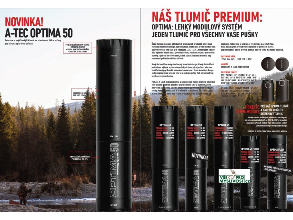 Řada A-TEC Optima zahrnuje modely Optima 60, Optima 50 a Optima 45 (určené pro opakovací i samonabíjecí zbraně bez předních mířidel), dále Optima Front (pro zbraně s pevnými mířidly) a Optima Flow (se sníženým protitlakem pro samonabíjecí lovecké a sportovní zbraně). Všechny modely využívají výměnný přední modul, takže můžete mít jeden tlumič a jen měnit modul podle ráže.
