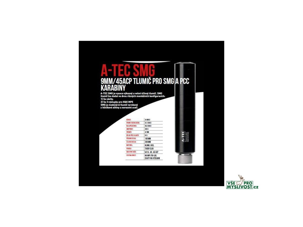 A-TEC SMG Tlumiče určeny pro samonabíjecí karabiny na pistolové náboje. Bude dodáván např. i pro karabiny EVO, Stribog, Heckler Koch, PCC atd. Modulový tlumič se všemi výhodami, jako snažší a pohodlnější čištění a údržba, možnost odebrání modulu pro kompaktnější rozměry.