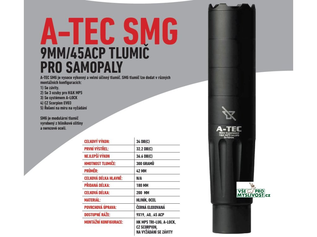 A-TEC SMG Tlumiče určeny pro samonabíjecí karabiny na pistolové náboje. Bude dodáván např. i pro karabiny EVO, Stribog, Heckler Koch, PCC atd. Modulový tlumič se všemi výhodami, jako snažší a pohodlnější čištění a údržba, možnost odebrání modulu pro kompaktnější rozměry. Tento závit je používán především na puškách typu AR15, aby nedošlo k záměně a instalaci úsťového zařízení na závit 1/2"-28 používaného pro ráže např. 5,56mm