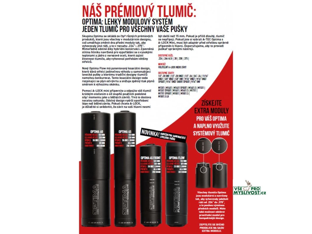 Řada A-TEC Optima nabízí modulární tlumiče hluku navržené pro lovecké a sportovní opakovací i samonabíjecí zbraně. Díky výměnnému přednímu modulu lze jeden tlumič upravit pro více ráží. Modely Optima 60 a Optima 45 jsou určeny pro zbraně bez předních mířidel, Optima Front je koncipována pro zbraně s předními mířidly a Optima Flow je speciálně optimalizována pro samonabíjecí platformy pomocí technologie A-FLOW.