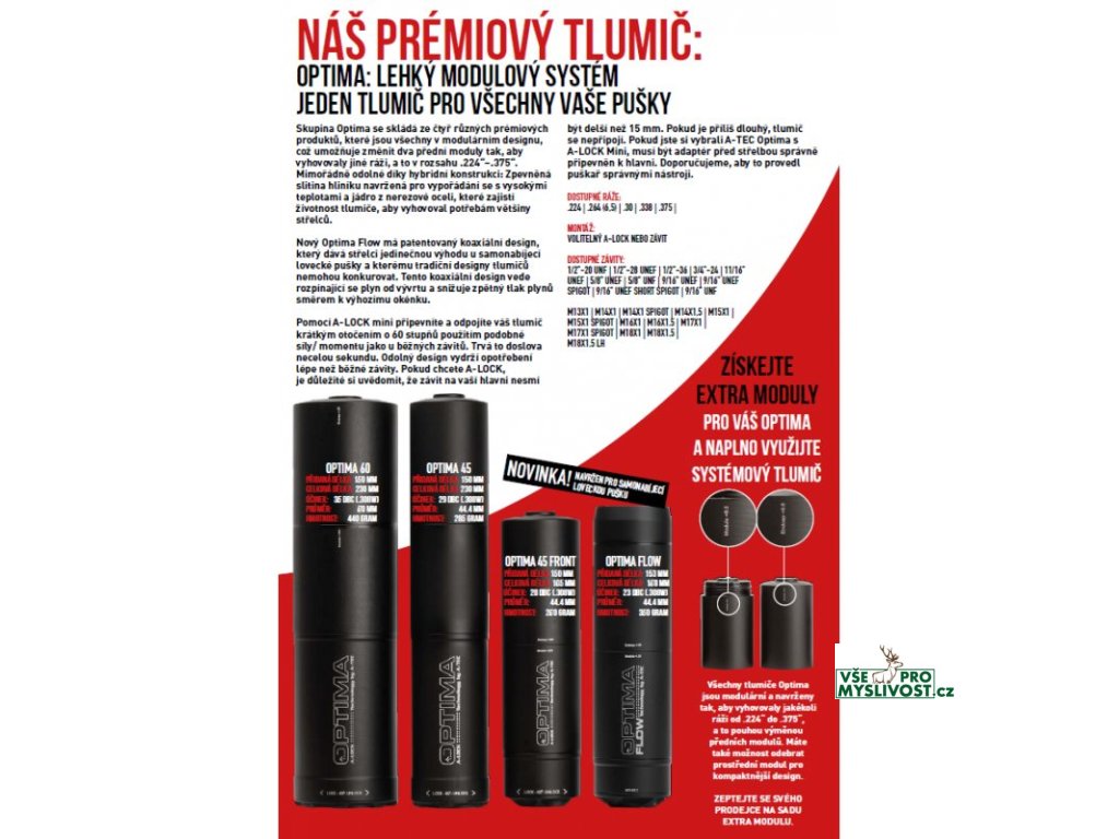 Řada A-TEC Optima nabízí modulární tlumiče hluku navržené pro lovecké a sportovní opakovací i samonabíjecí zbraně. Díky výměnnému přednímu modulu lze jeden tlumič upravit pro více ráží. Modely Optima 60 a Optima 45 jsou určeny pro zbraně bez předních mířidel, Optima Front je koncipována pro zbraně s předními mířidly a Optima Flow je speciálně optimalizována pro samonabíjecí platformy pomocí technologie A-FLOW.