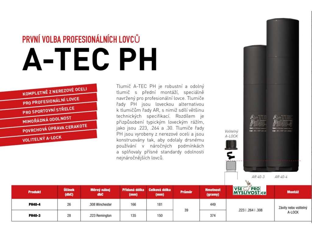 Tlumič A-TEC PH je robustní a odolný tlumič s přední montáží, speciálně navržený pro profesionální lovce. Tlumiče řady PH jsou loveckou alternativou k tlumičům řady AR, s nimiž sdílí většinu technických specifikací. Rozdílem je přizpůsobení typickým loveckým rážím, jako jsou .223, .264 a .30. Tlumiče řady PH jsou vyrobeny z nerezové oceli a jsou konstruovány tak, aby odolaly drsnému používání v náročných podmínkách a splňovaly přísné standardy odolnosti nejnáročnějších lovců. Jejich odolnost vyniká zejména při opravdu intenzivní střelbě ať už na lovu nebo na střelnici. Lze používat jak na opakovacích tak i samonabíjecích zbraních.