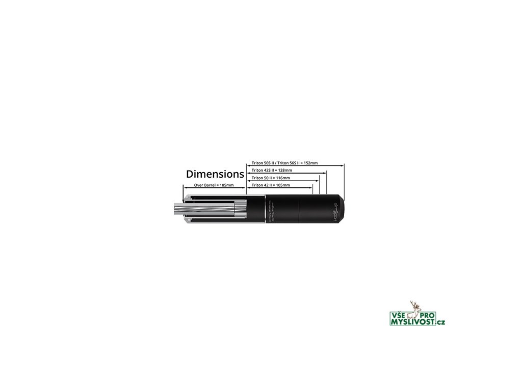 Model Triton No. 3 má malé rozměry, ale úžasný výkon (vhodný i na útočné zbraně typu AR), vhodný spíše pro menší ráže do 6,5x55 SE. K tlumiči Aimsport TRITON 3 lze dokoupit různé závity a můžete ho používat na více zbraních.