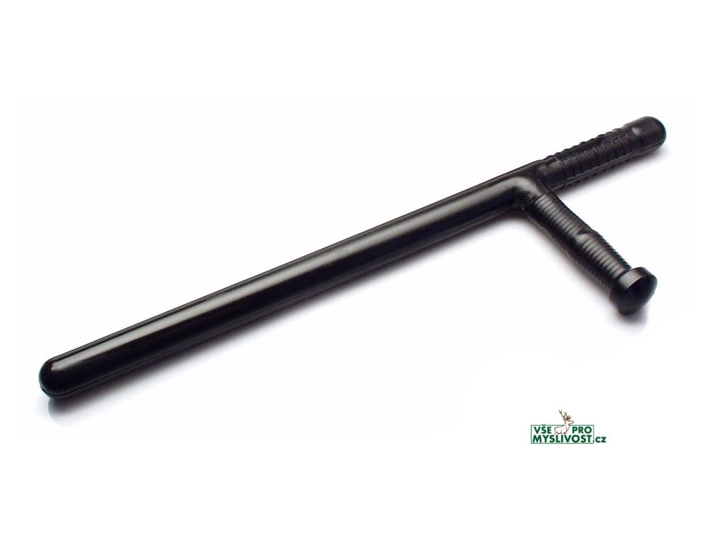 materiál černý tvrzený plast, klasický tvar nepravidelného T, délka 59 cm, se závěsem pro uchycení k opasku, váha 450 g