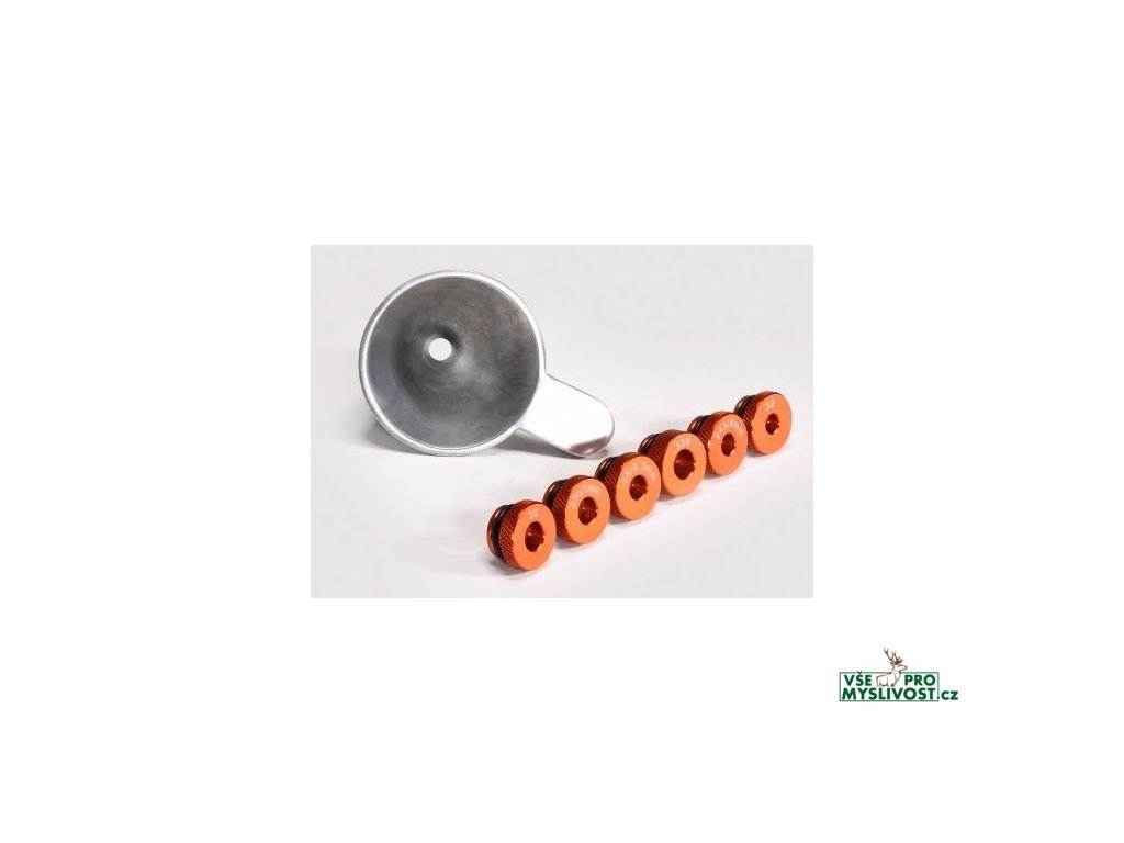 Tento trychtýř na prach není „univerzální pro všechny ráže“. Sada Brass Smith Funnel Set používá precizně CNC opracované vložky, které přesně navedou krček nábojnice. Vložky lze rychle a snadno instalovat zatlačením na místo, popř. naopak vytáhnout při změně ráže.