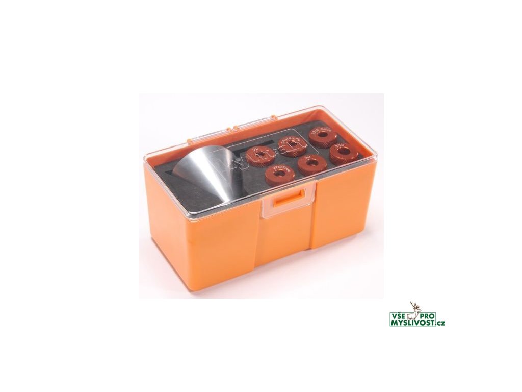 Sada trychtýře na prach Lyman je dodávána s polstrovaným úložným pouzdrem, které úhledně uloží Vaše veškeré, momentálně nepoužívané, vložky trychtýře. Balení obsahuje vložky pro ráže 223, 243/6mm, 25/6,5mm, 270/7mm, 30 a 338.