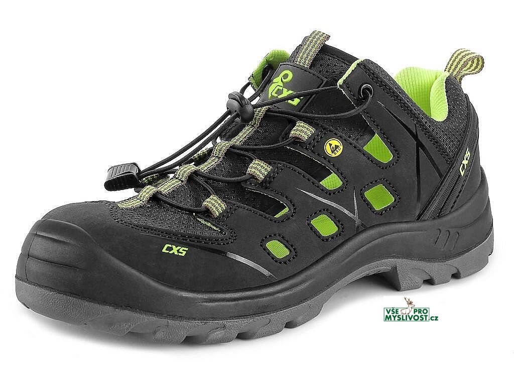Bezpečnostní sandál, ESD, kožený, perforovaný s plastovou špicí a planžetou Dyna-Flex®, reflexní doplňky. Materiál: svršek z 1,6 - 1,8 mm štípenkové nubukové kůže (z jednoho dílu), vnější TPU ochrana paty, podšívka z prodyšné oděru odolné textilie, podešev: PU-PU olejivzdorná, antistatická, protiskluzová, odolná proti propichu.