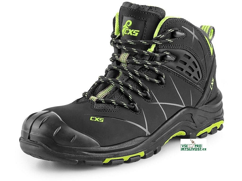 Kotníková bezpečnostní obuv, kožená, s plastovou špicí a planžetou Dyna-Flex®, reflexní doplňky. Materiál: svršek z 1,6 - 1,8 mm štípenkové nubukové kůže (z jednoho dílu), vnější TPU ochrana paty, bez kovových součástí, podšívka z prodyšné oděru odolné textilie, podešev: PU-guma, olejivzdorná, antistatická, protiskluzová, odolná proti propichu a kontaktnímu teplu do 300 °C.