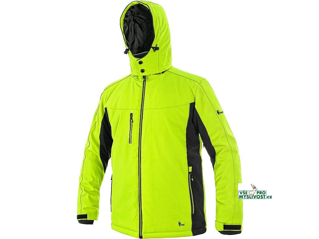 Pánská zateplená softshellová bunda, odolná proti vodě a větru, větrání v podpaží, odepínací kapuce, regulovatelná manžeta na rukávech a pružná manžeta v rukávech, stahování v dolním okraji, černé reflexní výpustky, TPU membrána, odolnost materiálu proti průniku vody 10 000 mm mimo oblast švů, paropropustnost 3 000 g/m2/24 h, podšívka je kombinací materiálů s fleecem, na levém spodním rukávu kapsička na zip, 2 spodní kapsy na zip, vnitřní kapsa.