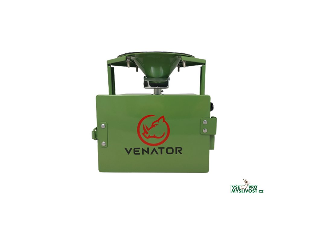 Kovový krmný automat Feed22S značky Venator s nastavitelným časováním a přídavným solárním panelem. Konstruovaný pro rozmetání krmiva v 360°.